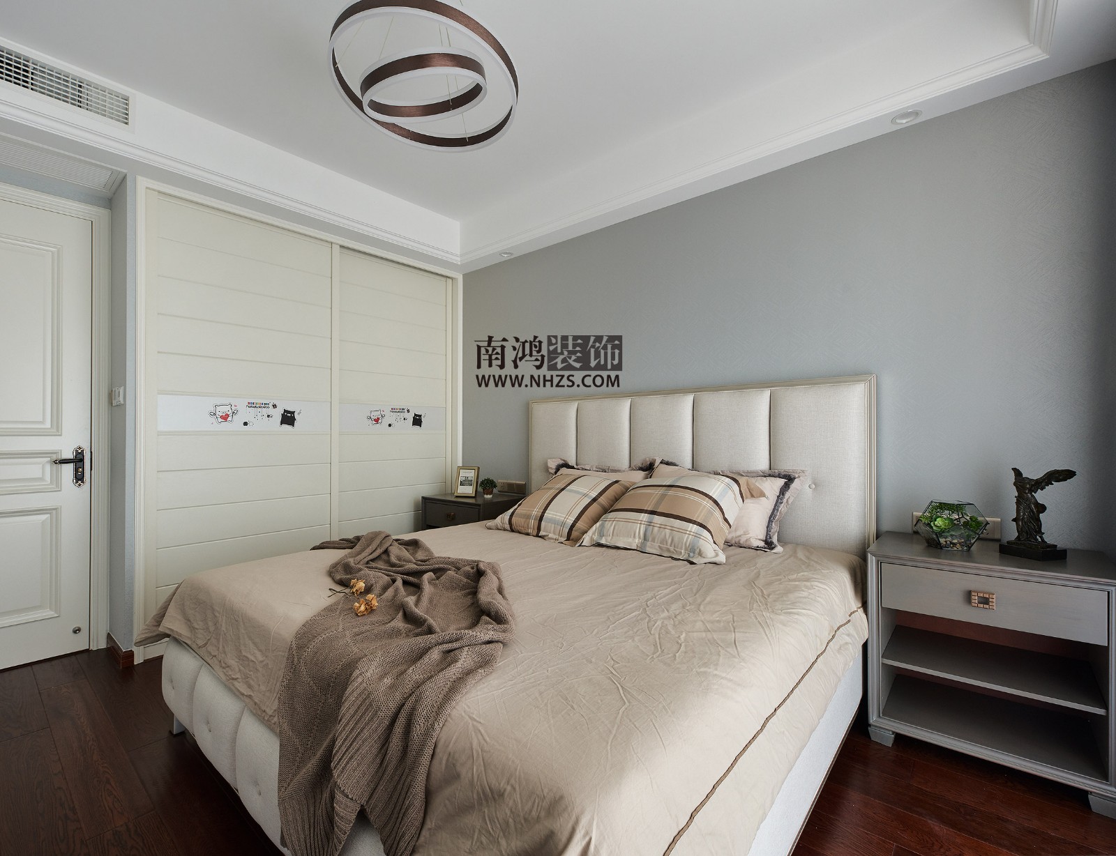 次臥是一個低調(diào)沉穩(wěn)的灰色空間,無論是頂部的藝術(shù)吊燈,還是深灰色的床頭柜,造型都非常簡約。落地窗為室內(nèi)導(dǎo)入通透光線,顯得清爽而透亮。