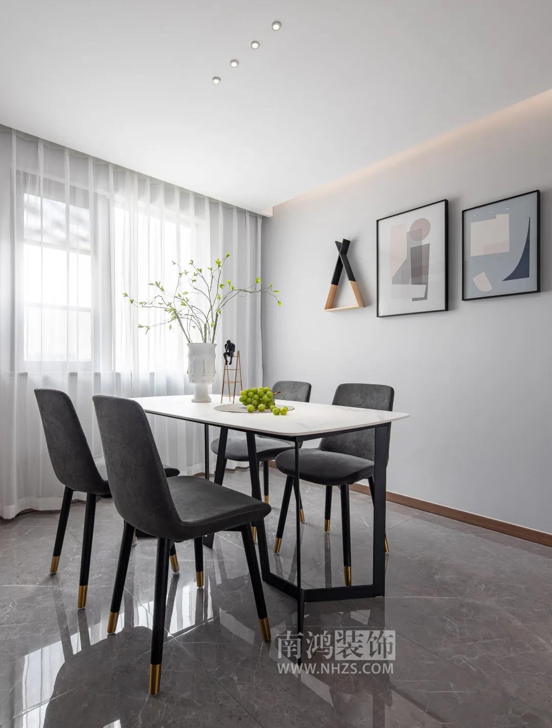 地址 / 締壹城 戶型 / 四室兩廳 面積 / 135㎡ 風(fēng)格 / 現(xiàn)代風(fēng)格 設(shè)計(jì)施工 / 浙江南鴻裝飾 本案為寧波締壹城現(xiàn)代風(fēng)格作品。業(yè)主是一對年輕夫妻,家里有一雙尚年幼的兒女,他們希望這個(gè)新家能融合許多時(shí)尚前衛(wèi)的小細(xì)節(jié)。 本案的材質(zhì)選用有大理石磚、木飾面、不銹鋼條、硅藻泥等,配以大量輔助光源來打造業(yè)主的理想居所。 戶 型 圖 客 廳 Living Room 客廳足夠簡潔敞亮,陽臺被包進(jìn)來做抬高處理,成為一處不錯(cuò)的休閑場所。家具挑選得都較為低矮,無形中拉伸了層高,也讓空間更為通透。 電視背景墻選用爵士白大板磚背景結(jié)合金色不銹鋼打造的開放柜,個(gè)性突出,木質(zhì)的地柜與木格柵元素?fù)诫s進(jìn)溫潤的視感,平衡了冷暖溫度。 三幅組合裝飾畫懸掛于沙發(fā)背景墻,干凈明晰,不著多余的色彩,挺拔的綠植安靜地立于一側(cè),默默為空間注入清新之感,灰色主沙發(fā)完美契合基調(diào)。 客廳望向餐廳。頂部是無主燈設(shè)計(jì),燈光也要貼合現(xiàn)代風(fēng)格的簡潔特征。 餐 廳 Dining Room 餐廳,纖薄的石材桌面搭配簡約風(fēng)的灰色餐椅,桌椅低調(diào)至簡,再配上白紗簾,頗有清風(fēng)徐來的唯美之意。 廚 房 Kitchen 廚房面積雖有限,使用起來可一點(diǎn)兒不會(huì)拘束,L型的結(jié)構(gòu)最大化利用了空間又讓動(dòng)線足夠流暢。深灰的櫥柜搭配黑色拉手,簡潔又大氣。 臥 室 Bedroom 將飄窗擴(kuò)進(jìn)后,主臥的采光與視野變得更好,整體使用白與灰的配色,溫柔寧靜。如此賞心悅目的臥室,可以讓人快速放松身心,卸去疲憊。 兒童房用清新的藍(lán)調(diào)布置背景,可愛的小動(dòng)物圖案契合孩子幼小純真的心性,整體色彩沒有艷麗的感覺,卻足夠有趣分明。 書 房 Study 書房的布置比較簡單,以實(shí)用為主,柜子均是現(xiàn)場制作。木材細(xì)膩的光澤感,仿佛天生就自帶了一層柔光濾鏡。 衛(wèi) 生 間 Toilet 兩個(gè)衛(wèi)生間在風(fēng)格上是統(tǒng)一的,黑色的粗線條邊框牢牢占住視線,鏡子旁的開放式層架、墻上的壁龕及懸空的浴室柜設(shè)計(jì),讓空間實(shí)用又美觀。