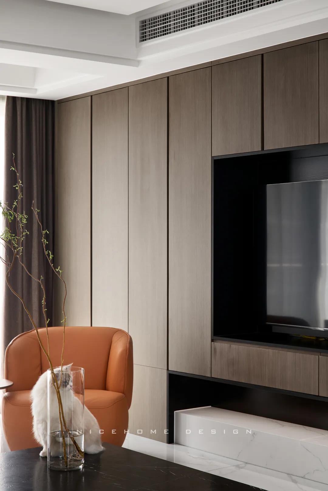 電視背景墻做整面的柜體,地臺取代電視柜的位置,與上方柜體拉開一定距離,削減了一定厚重感。茶幾臺面選擇巖板材質,四四方方的造型含規整有序之意。