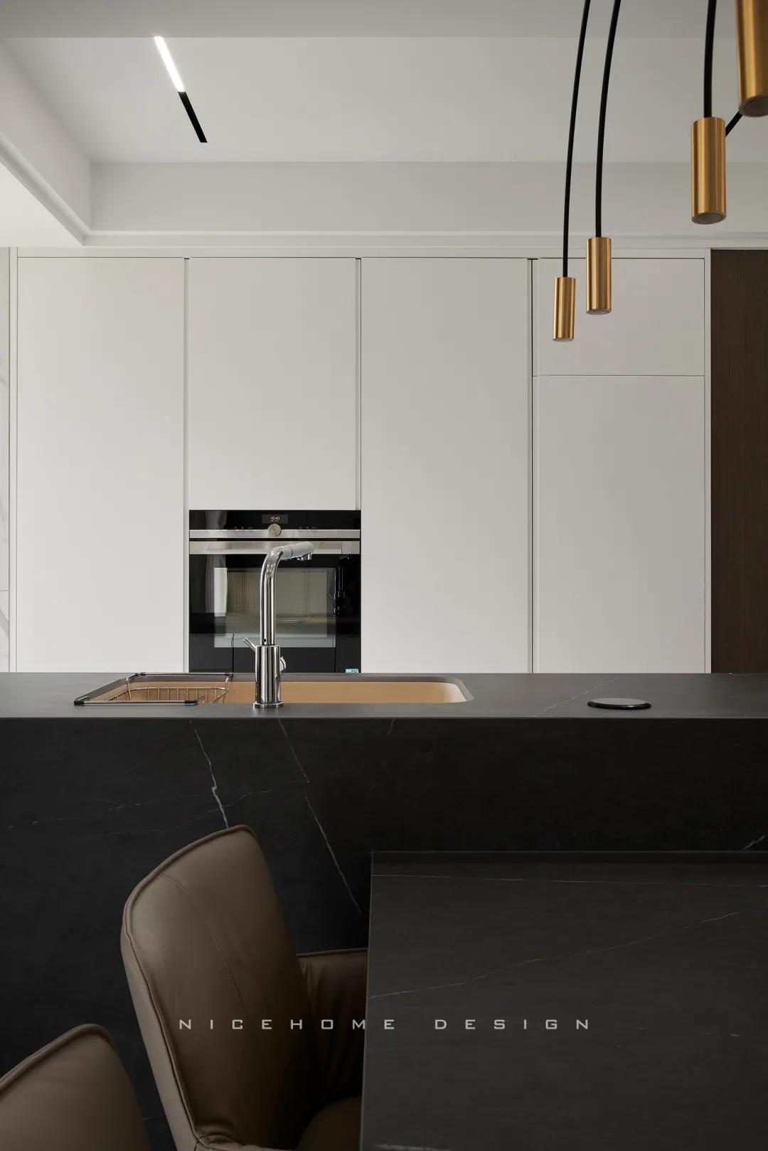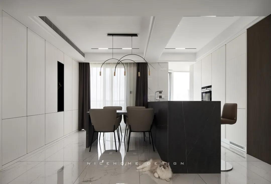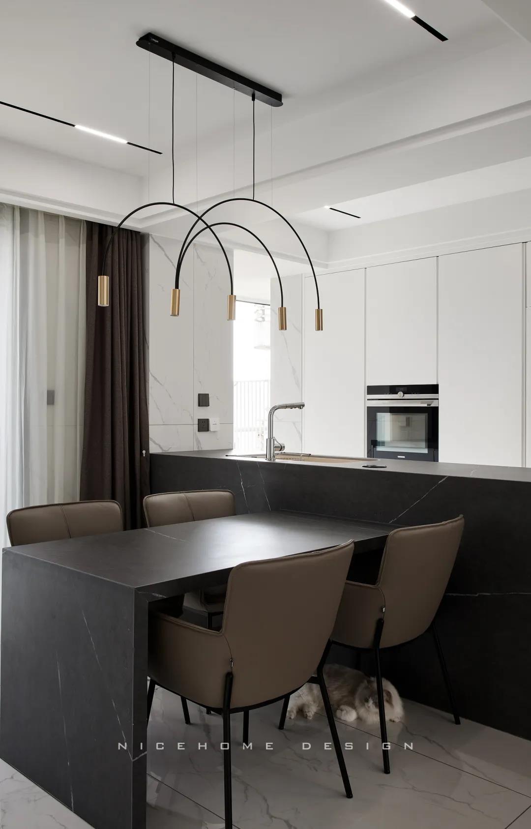 一體成型的黑色巖板餐桌結合西廚島臺,塑造空間純粹內斂的高級質感,清冷有型之中悄然散發出精致韻味。