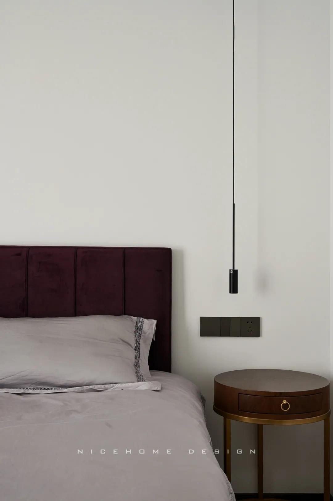 主臥內部利用陽臺拓展使用空間與視覺深度,同時讓更多的自然光線進入房間。背景墻留白,絳紫色絨布床頭詮釋著優雅,陽臺處擺放主人的健身器械方便早起運動。